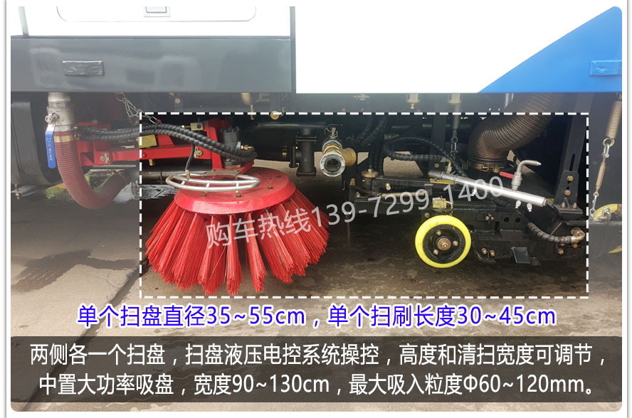 二、上裝配置: 1、帶2個中置掃盤;中置超寬吸嘴;雙層吸塵筒;康明斯170馬力副發動機,3800軸距多利卡配江鈴64kW增壓副發動機;臺灣液壓閥;大力馬達;德國高壓水泵(前沖/側噴/中噴/后噴霧)/側沖洗水槍/垃圾箱自潔裝置);萬向高壓路沿清洗;威龍低壓泵(前沖),氣動球閥控制;4mm不銹鋼垃圾箱;不銹鋼水箱;德國控制器;尾部箭頭燈;機油、垃圾箱、水箱均帶防溢或低位報警裝置;倒車及洗掃狀態室內監視器;多種語音提示;倒車自動保護、防傾倒垃圾翻車保護、檢修安全保護;20m高壓沖洗卷盤;刷臂轉動機構使用德國進口高新耐磨工程隔套